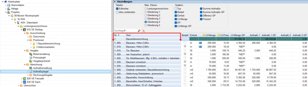 Festgesetzte Spalten im Aufmaßspiegel