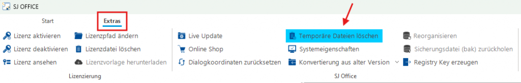 - klicken Sie über die obere Menüleiste von SJ OFFICE unter Extras im Bereich SJ Office auf Temporäre Dateien löschen