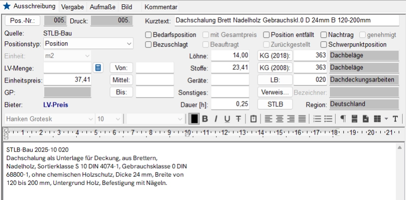 Die Baupreise stellen sich dynamisch aus einer Musterkalkulation zusammen. So sind die Preise immer in Abhängikeit von den hinterlegten Daten bzw. dem Text der Positionsbeschreibung. Die Musterkalkulation arbeitet aus einer Datenbank die von dem DIN sowie GAEB bereitgestellt wird.