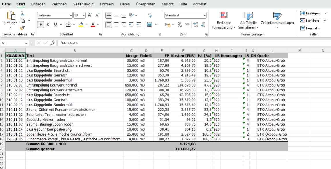 - Kostenübersicht in Kostengruppen und Leistungsbereiche nach DIN 276