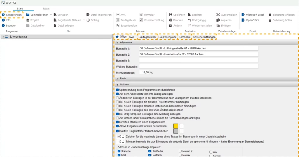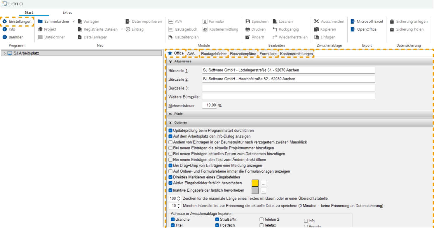 Über die Grundeinstellungen von SJ OFFICE kann das Programm individuell angepasst werden. So können die Wiedergabe von Informationen und die visuelle Darstellung individuell eingerichtet und festgelegt werden.