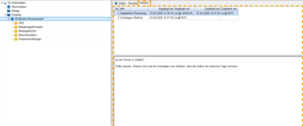 Sie haben dort die Möglichkeit projektbezogene Notizen einzutragen und zu verwalten.