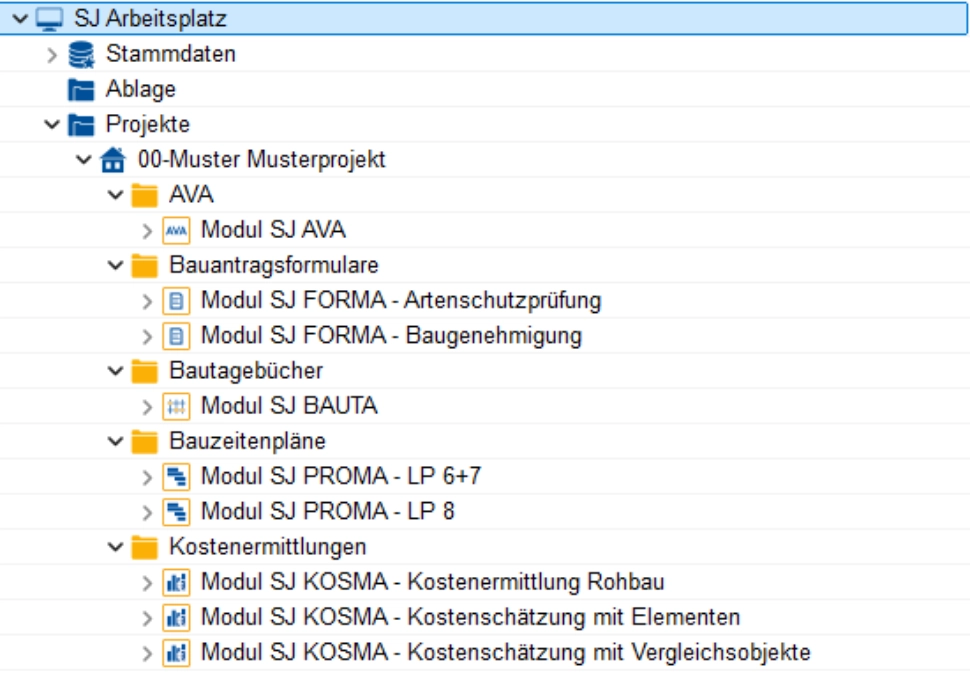 Er ist in die Sammelordner Stammdaten, Ablage und Projekte unterteilt. Der Aufbau des SJ Arbeitsplatzes orientiert sich an der Struktur des klassischen Windows Explorers.